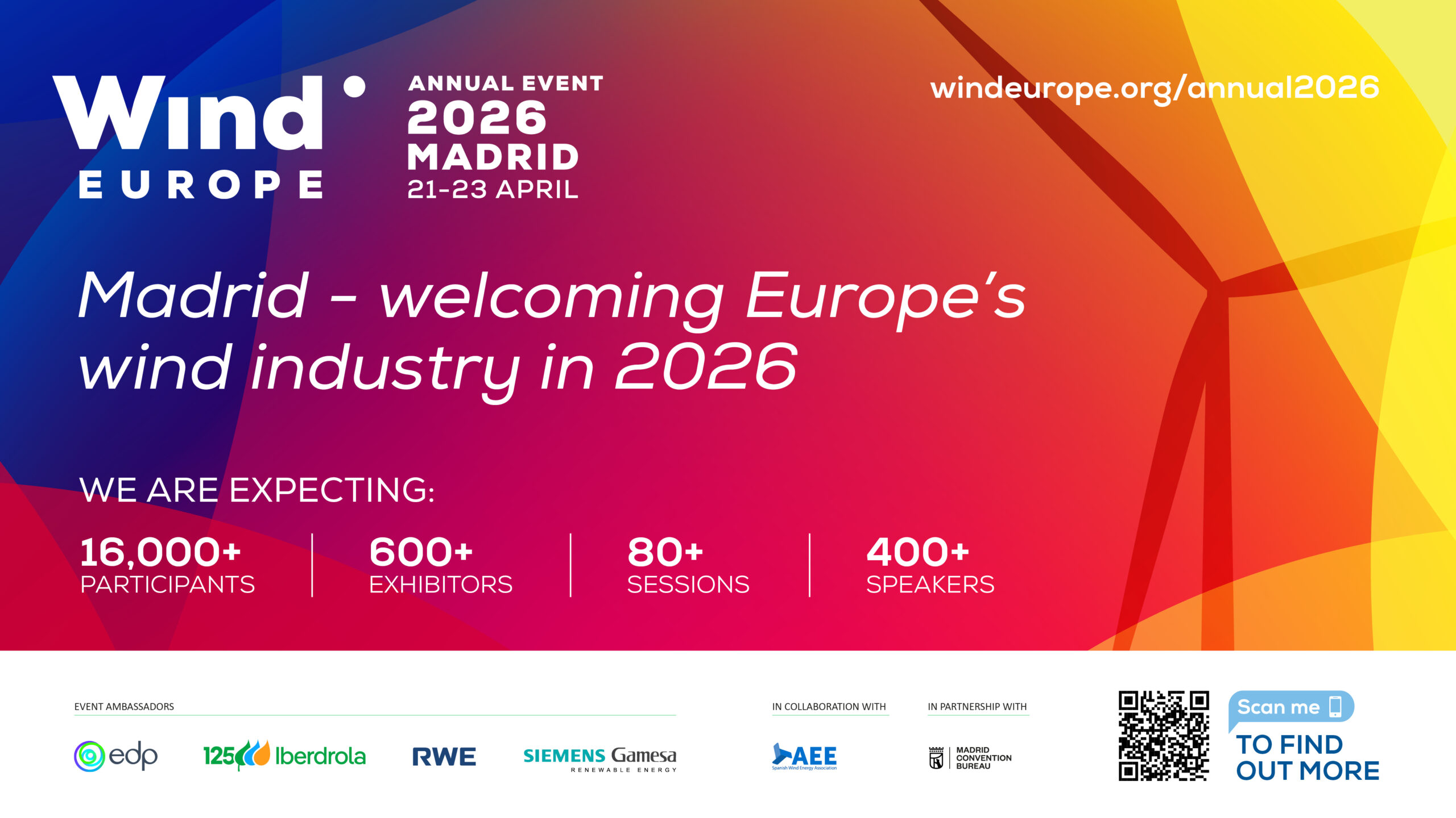 Todos estos temas y muchos más los podrás conocer del 21 al 23 de abril en Madrid, en el Evento Anual de WindEurope 2026, organizado por la Asociación Eólica Europea WindEurope y con la colaboración de la Asociación Empresarial Eólica. Más de 16.000 profesionales de toda la cadena de valor de la energía eólica se darán cita en IFEMA Madrid, con más de 600 empresas expositoras y más de 400 ponentes. No te pierdas este evento ineludible. ¡Te esperamos!